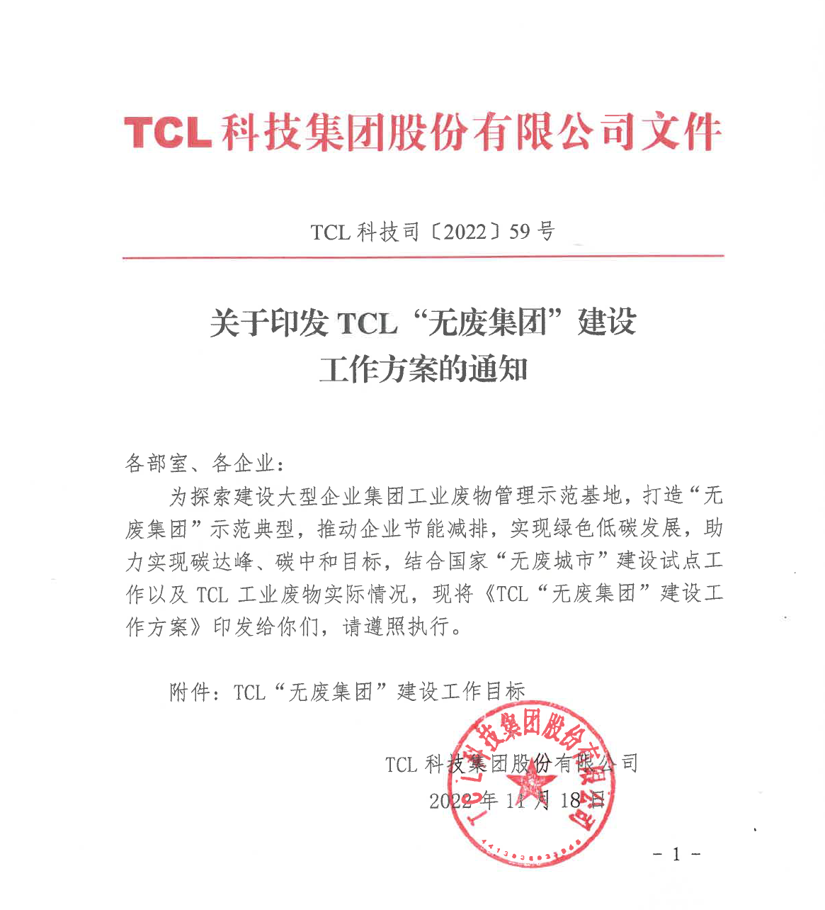 TCL于2022年11月18日正式印发《TCL“无废集团”建设工作方案》,探索建设大型企业集团工业废物管理示范基地,打造“无废集团”示范典型。