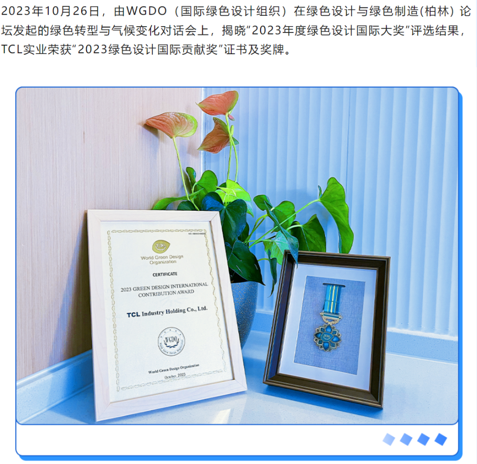 近年来,TCL积极推动“无废集团”建设,推动人与自然和谐共存。TCL科技《2022年ESG报告》荣获年度杰出责任报告;TCL中环入选福布斯中国2022年可持续发展工业企业TOP50;2023年深圳华星荣获2022年度广东省减污降碳突出贡献企业;深圳华星 t1、t2 项目获得零碳工厂评价证书、LEED 铂金级双认证、研发楼获得深圳近零碳排放建筑示范试点项目;TCL实业荣获2023绿色设计国际贡献奖等。